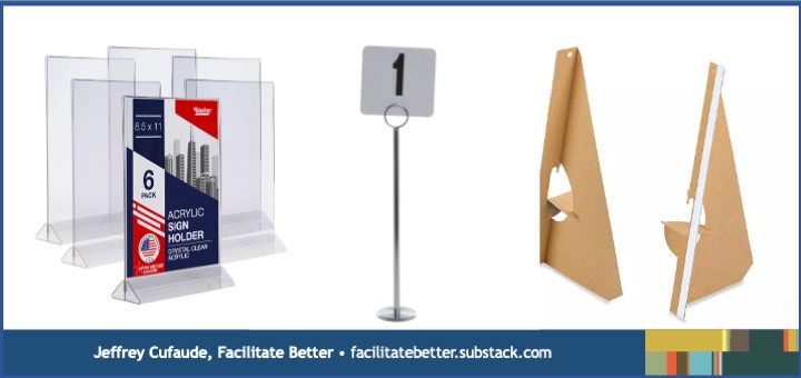 Provide visuals at tables instead of (or to augment) screen displays. This changes the visual focus and can make a setting feel more personal. Use stanchions, acrylic display stands, or cardboard easels. I often ask groups to place a green square in their stanchion when finished with an activity or a red one if stuck and needing assistance.